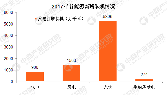 新增裝機方面,2017年全國水電新增裝機約900萬千瓦;風電新增裝機1503萬千瓦,繼續(xù)保持穩(wěn)步增長勢頭,中東部和南方地區(qū)占比50%,風電開發(fā)布局進一步優(yōu)化,山東、河南、陜西、山西新增裝機均超過100萬千瓦;生物質(zhì)發(fā)電新增裝機274萬千瓦,累計裝機達到1488萬千瓦,同比增長22.6%;全年生物質(zhì)發(fā)電量794億千瓦時,同比增長22.7%,繼續(xù)保持穩(wěn)步增長勢頭;受上網(wǎng)電價調(diào)整等多重因素影響,2017年光伏發(fā)電市場規(guī)??焖贁U大,新增裝機5306萬千瓦,其中,光伏電站3362萬千瓦,同比增加11%;分布式光伏1944萬千瓦,同比增長3.7倍。