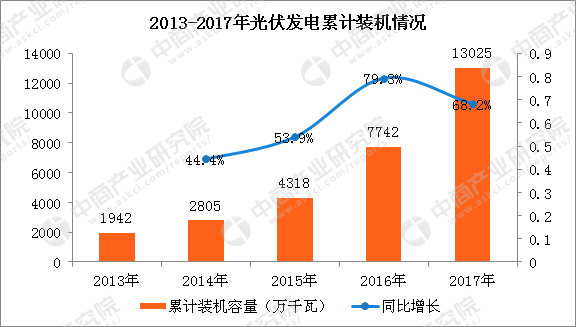 到2017年12月底,全國光伏發(fā)電裝機達到1.3億千瓦,其中,光伏電站10059萬千瓦,分布式光伏2966萬千瓦。而此前太陽能“十三五”規(guī)劃的目標僅105GW,已經(jīng)提前并超額完成了“十三五規(guī)劃目標”。“十三五”以來,隨著太陽電池技術(shù)進步的快速提高,太陽電池生產(chǎn)成本和光伏發(fā)電成本快速下降,在各項光伏政策的支持下,我國光伏發(fā)電市場繼續(xù)保持快速發(fā)展。