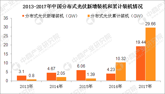 受上網(wǎng)電價調(diào)整等多重因素影響,2017年光伏發(fā)電市場規(guī)??焖贁U大,新增裝機5306萬千瓦,其中,光伏電站3362萬千瓦,同比增加11%;分布式光伏1944萬千瓦,同比增長3.7倍。2017年我不哦分布式光伏累計裝機2966萬千瓦,其中,分布式光伏新增裝機1944萬千瓦。