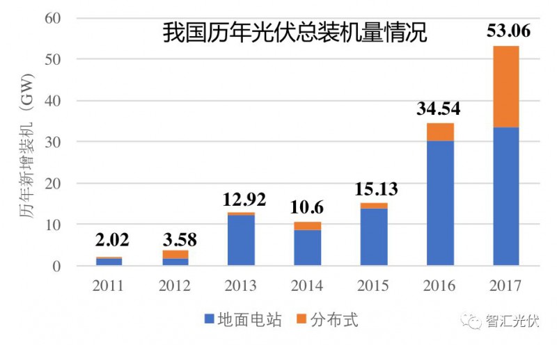 2017年,光伏新增裝機(jī)5306萬(wàn)kW,首次超過(guò)火電,成為第一大新增電力裝機(jī)。