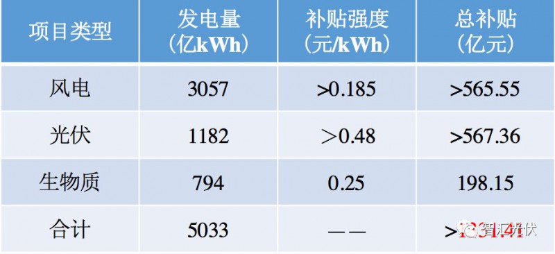 2017年風(fēng)電、光伏、生物質(zhì)的發(fā)電量分別是3057億kWh、1182億kWh、794億kWh,所需的補(bǔ)貼累計(jì)1331.41億元以上。如下表所示。