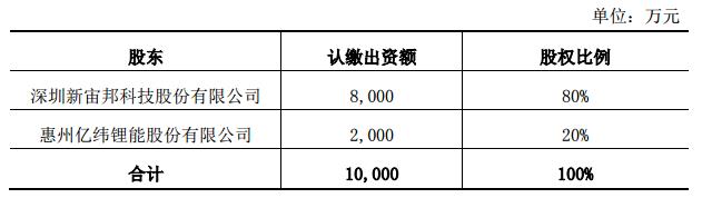 (一)惠州億緯鋰能股份有限公司(以下簡稱“公司”)擬與深圳新宙邦科技股份有限公司(以下簡稱“新宙邦”)共同出資設立荊門新宙邦電池材料有限公司(暫定,最終以工商登記主管部門核準的公司名稱為準,以下簡稱“合資公司”)。合資公司注冊資本為人民幣10,000萬元,其中公司出資額人民幣2,000萬元,占注冊資本總額的20%。