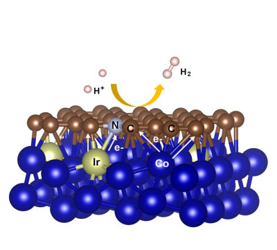 銥鈷合金可向表面活性位點(diǎn)轉(zhuǎn)移電子,銥鈷合金表面包覆的氮摻雜的石墨烯層類似于“鎧甲”,有利于防止合金內(nèi)核被酸腐蝕。作為酸性析氫電催化劑(其中銥的含量?jī)H為1.56 wt.%),其塔菲爾斜率僅為23 mV/dec,達(dá)到10mA/cm2電流密度時(shí)其過電位僅為24mV,顯示出與商用的20%Pt/C電催化劑可比的電催化析氫性能。密度泛函理論模擬計(jì)算發(fā)現(xiàn),氮摻雜原子近鄰的碳原子是電催化反應(yīng)的活性位點(diǎn),銥的引入促進(jìn)了電子向類石墨烯層表面遷移,降低了活性位點(diǎn)的氫吸附自由能。材料的表面結(jié)構(gòu)表征和元素成分成像分析等,揭示了氮元素?fù)诫s量的增加以及銥元素在合金內(nèi)核表面的富集有利于催化劑性能的提升。該工作為今后尋找更為廉價(jià)、高效的電催化析氫催化劑提供了一種新思路。