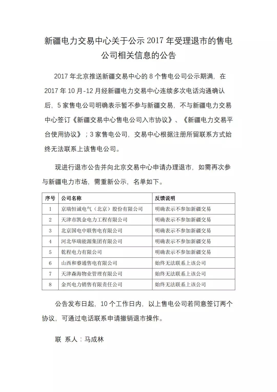 中國儲能網(wǎng)訊:1月10日,新疆電力交易中心發(fā)布了《關(guān)于公示2017年受理退市的售電公司相關(guān)信息的公告》。其中公示的退市售電公司一共8家,5家已經(jīng)明確表示不參加新疆電力市場化交易,另外3家則是因?yàn)槭冀K聯(lián)系不上而登上的退市公示名單。