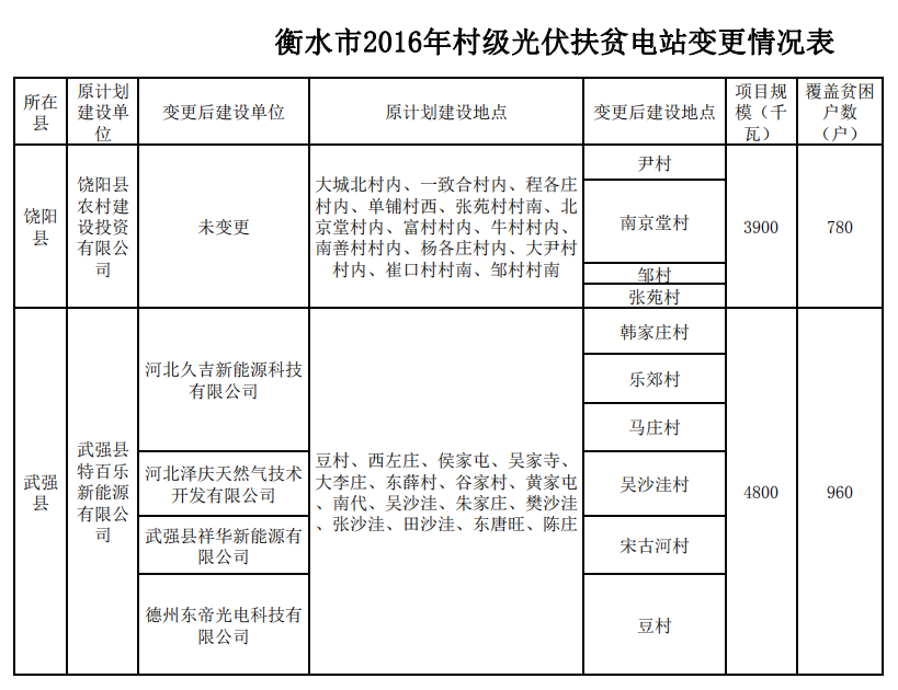 四、同意饒陽縣村級光伏扶貧電站進行聯(lián)村并建,原計劃建設的南善、楊各莊2個,變更至大尹村聯(lián)建;大城北、一致合、程各莊、單鋪、北京堂、崔口、富村、牛村8個村變更到南京堂村進行聯(lián)建,其他內(nèi)容不變(詳見附表)。