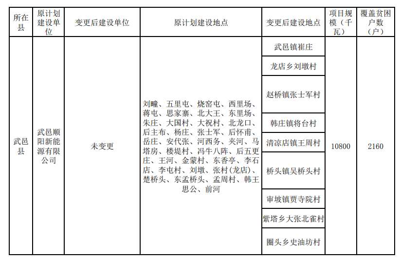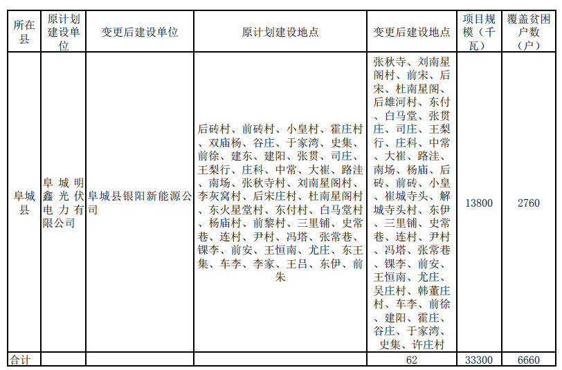 一、同意阜城縣村級光伏扶貧電站建設單位由阜城明鑫光伏電力有限公司變更為阜城縣銀陽新能源公司,并承擔后續(xù)扶貧工作;項目地點由原45個站點調(diào)整為43個,取消列入計劃的雙廟楊、建東、李灰、東火、前黎、東王集、李家、王呂、前朱等9個,增加許莊、前宋、后雄、吳莊、韓董、崔城寺頭、謝城寺頭等7個,覆蓋貧困戶數(shù)及規(guī)模不變(詳見附表)。