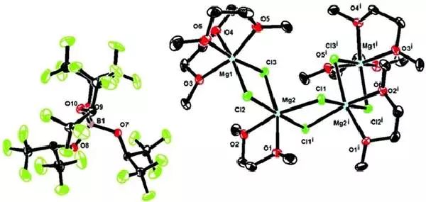 【圖文導(dǎo)讀】圖1:[Mg4Cl6(DME)6] [B(HFP)4]晶體的分子結(jié)構(gòu)橢球圖(氫鍵被忽略)