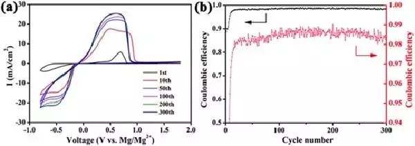 a)Cu電極在0.5M的硼酸鎂基電解質(zhì)中,以10mV/s掃描速率,在-0.8V與1.8V之間掃描得到的循環(huán)伏安曲線,300次充放電過(guò)程;