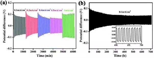 a)0.5M的硼酸鎂基電解質(zhì)Mg/Mg對(duì)稱電池的極化性能(電流密度為:0.1,0.2,0.4,0.5和1mA/cm2+);