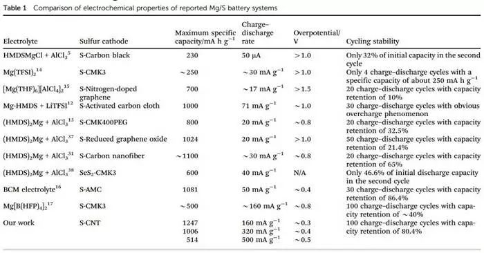 表1:已報(bào)道中Mg/S電池不同電極的電化學(xué)性能對(duì)比