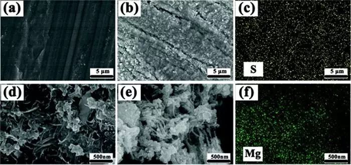 d)未反應(yīng)的S-CNT負(fù)極圖像(d)與以2V條件下100次循環(huán)后達(dá)到幾乎完全充電狀態(tài)的S-CNT負(fù)極圖像(e);