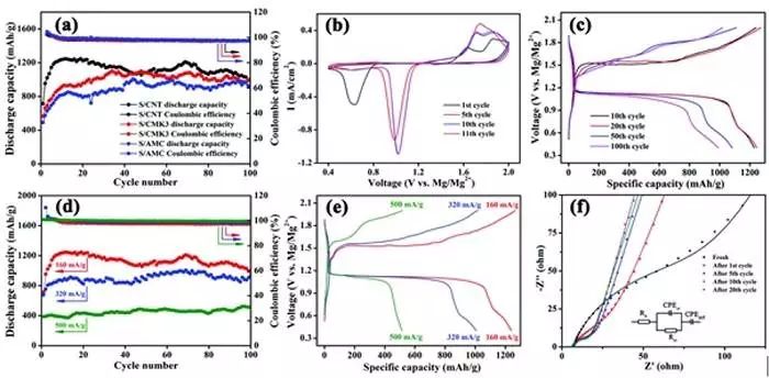 a) 5M的硼酸鎂基電解質(zhì)中,作為循環(huán)次數(shù)函數(shù)的不同S-C復(fù)合負(fù)極的放電容量和庫(kù)倫效率曲線(放電速率為:160mA/g);