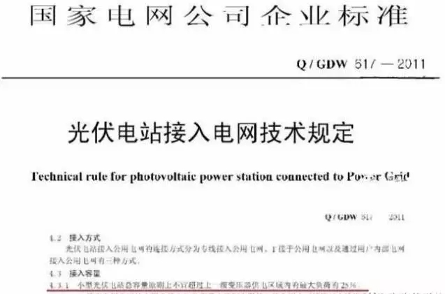 根據國家電網公司 《光伏電站接入電網技術規(guī)定》(Q/GDW 617-2011)4.3.1要求:小型光伏電站總容量不宜超過上一級變壓器供電區(qū)域內最大負荷的25%。