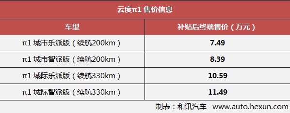 中國儲(chǔ)能網(wǎng)訊:北京時(shí)間10月10日,云度汽車品牌首款車型π1正式上市,新車為純電動(dòng)力驅(qū)動(dòng),共推出200km和330km兩種續(xù)航版本,共計(jì)4款車型,廠商指導(dǎo)價(jià)13.89-19.75萬元,北京地區(qū)補(bǔ)貼后終端售價(jià)為7.49-11.49萬元,詳情見下表: