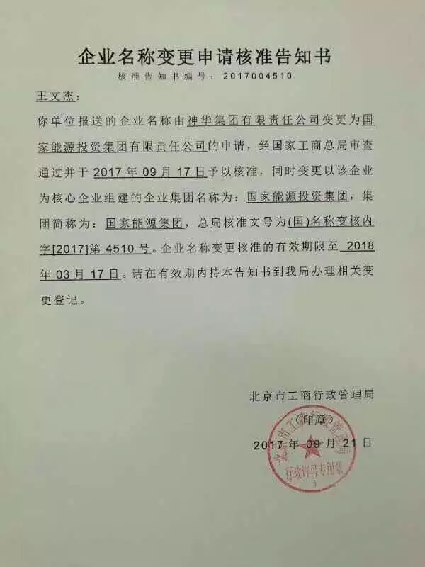 “神華集團(tuán)有限責(zé)任公司”于9月17日被核準(zhǔn)變更為“國(guó)家能源投資集團(tuán)有限責(zé)任公司”;核心企業(yè)組建的企業(yè)集團(tuán)名稱變更為“國(guó)家能源投資集團(tuán)”;集團(tuán)簡(jiǎn)稱為“國(guó)家能源集團(tuán)”。