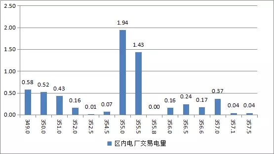 冀北統(tǒng)調(diào)15家發(fā)電企業(yè)參與交易,成交均價(jià)為355.53元/千千瓦時(shí),成交價(jià)最高為357.50元/千千瓦時(shí),成交價(jià)最低為349.00元/千千瓦時(shí)。區(qū)內(nèi)電廠(含張家口電廠、王灘電廠)成交電量電價(jià)區(qū)間如下: