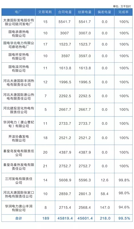 15家冀北統(tǒng)調(diào)電廠參與直接交易,合同電量4.58億千瓦時(shí),實(shí)際結(jié)算電量4.56億千瓦時(shí),完成率約99.5%。