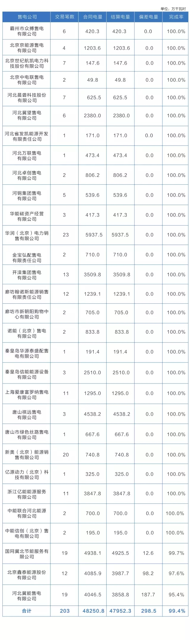 售電公司共達(dá)成交易203筆,交易電量4.83億千瓦時(shí),實(shí)際結(jié)算電量4.80億千瓦時(shí),完成率99.4%。售電公司代理用戶(hù)總偏差電量298.5萬(wàn)千瓦時(shí),占總偏差電量的65.2%。