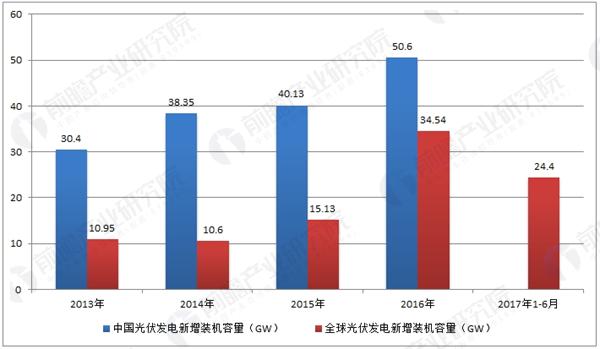 據(jù)前瞻產(chǎn)業(yè)研究院《光伏發(fā)電產(chǎn)業(yè)市場(chǎng)前瞻與投資戰(zhàn)略規(guī)劃分析報(bào)告》統(tǒng)計(jì),全球太陽能光伏發(fā)電累計(jì)裝機(jī)容量由2012年的100.5GW增長到2016年的306.5GW,年均復(fù)合增長率高達(dá)32.15%。從全球光伏發(fā)電新增裝機(jī)容量來看,中國2016年光伏新增裝機(jī)容量為34.54GW,領(lǐng)跑全球光伏市場(chǎng)。