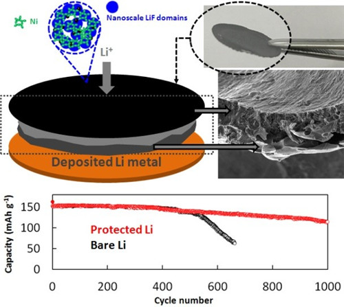 近期,該團(tuán)隊(duì)與中科院上海硅酸鹽研究所研究員郭向欣、美國太平洋西北國家實(shí)驗(yàn)室教授張繼光合作,開發(fā)了一種可移植性富LiF層作為器件化的鋰金屬保護(hù)膜(圖2)。該保護(hù)膜由交聯(lián)的納米級(jí)LiF域構(gòu)成,可將新沉積的金屬鋰與電解液溶劑隔開,避免直接接觸及副反應(yīng),從而大幅度提升鋰金屬負(fù)極的循環(huán)性能。此外,這種可移植保護(hù)膜能夠直接用作眾多鋰金屬電池體系的獨(dú)立保護(hù)組件,對(duì)電池性能的提升具有很好的促進(jìn)作用。此部分研究成果發(fā)表在Nano Energy上。