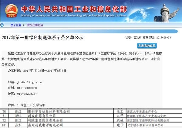 中國儲能網(wǎng)訊:近日,國家工信部網(wǎng)站公示“2017年第一批綠色制造體系示范名單”,超威電源有限公司及其子公司山東超威電源有限公司入選首批國家級綠色工廠企業(yè),在首批9家進入名單的電池企業(yè)中占據(jù)2個席位。