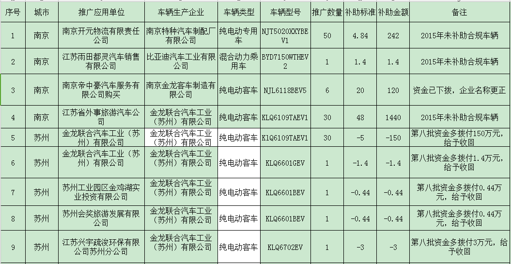 部分新能源汽車推廣應(yīng)用補(bǔ)助資金調(diào)正表(車輛)