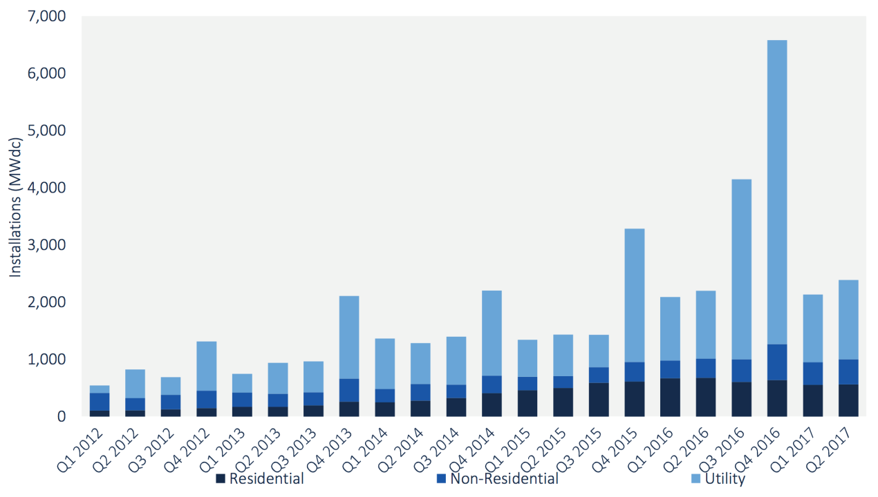 中國儲能網(wǎng)訊:根據(jù)美國太陽能工業(yè)協(xié)會及GTM關于美國太陽能市場的研究報告顯示,2017年Q2,美國光伏裝機為2.387GW,同比增長了8%。