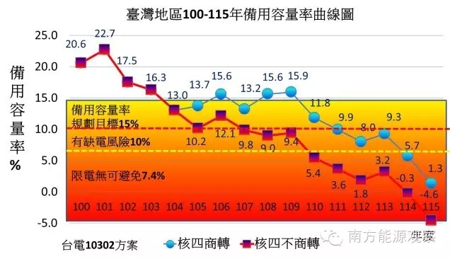 臺(tái)灣能源局(上)和臺(tái)電(下)未來(lái)電力備用容量率變化趨勢(shì)預(yù)估