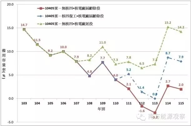首先,包括臺(tái)灣經(jīng)濟(jì)部能源局在內(nèi)的多方官方和研究機(jī)構(gòu)均指出,如果核四兩臺(tái)機(jī)組不能按原計(jì)劃分別在2017和2018年投運(yùn)(目前已幾乎無(wú)可能實(shí)現(xiàn)),將導(dǎo)致臺(tái)灣的備用容量率在未來(lái)十年快速降低,頻繁缺電限電的情況將不可避免。未來(lái)10年,除了三座在運(yùn)核電廠陸續(xù)到期停運(yùn)(裝機(jī)共500萬(wàn)千瓦),協(xié)和、大林、通霄以及臺(tái)中四座火力發(fā)電廠(裝機(jī)共560萬(wàn)千瓦)也將陸續(xù)退役。臺(tái)電在其2015年3月發(fā)布的最新負(fù)載預(yù)測(cè)10403案中預(yù)估,未來(lái)臺(tái)灣的尖峰負(fù)載將由2014年的3480萬(wàn)千瓦逐年遞增至2026年的4300萬(wàn)千瓦,平均年增長(zhǎng)1.8%。而臺(tái)灣在同一時(shí)期預(yù)計(jì)新增容量(包括民營(yíng)可再生能源635萬(wàn)千瓦)為2000萬(wàn)千瓦,即使這些規(guī)劃容量全部順利投產(chǎn)(部分煤電機(jī)組面臨反對(duì),臺(tái)灣的天然氣接收站容量也接近極限),到2026年其可用裝機(jī)也僅為4385瓦千瓦,屆時(shí)的備用容量率將僅為2.0%。臺(tái)電基于其孤島電力系統(tǒng)的特點(diǎn),將電力備用容量率安全線設(shè)為15%。值得一提的是,民進(jìn)黨認(rèn)為15%的備用率過(guò)高,在其2014年推出的《新能源政策》中主張將此安全線調(diào)低至10%。根據(jù)臺(tái)灣經(jīng)濟(jì)部能源局的預(yù)估,如果核四廠無(wú)法順利商運(yùn)發(fā)電,最快自2016年開始備用容量率會(huì)接近10%,并且逐年下降趨勢(shì),2021年將可能接近5%。根據(jù)臺(tái)灣以往的經(jīng)驗(yàn),當(dāng)備用容量率低于10%時(shí),就可能有缺電風(fēng)險(xiǎn),低于7.4%時(shí),則限電幾乎無(wú)法避免。1990-1996年間,臺(tái)灣電力備用容量率皆在7.4%以下,總計(jì)限電次數(shù)高達(dá)43次,其中1994年更高達(dá)16次。2015年夏天,臺(tái)灣經(jīng)濟(jì)部就發(fā)布通告稱備用容量率估算將降至10.4%,遠(yuǎn)低于安全線15%,在 7、8月份用電高峰期,短期備用容量率甚至低至 3.3%,已經(jīng)呈現(xiàn)出嚴(yán)重的供電吃緊狀況。
