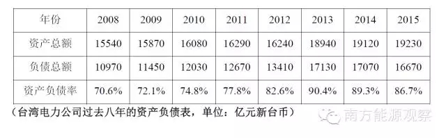 最后,如果核四廢棄,臺(tái)灣電力公司將可能因高額債務(wù)面臨破產(chǎn)危機(jī)。核四目前的投資已經(jīng)接近3000億新臺(tái)幣,如果民進(jìn)黨政府廢棄核四,意味著這筆巨額投資將轉(zhuǎn)化為臺(tái)電的債務(wù),而2015年,臺(tái)電資產(chǎn)總額為19230億,負(fù)債總額16670億元,算上核四的3000億,總債務(wù)將超過(guò)資產(chǎn)總額,臺(tái)電屆時(shí)將面臨破產(chǎn)。事實(shí)上,隨著臺(tái)灣燃?xì)獍l(fā)電比例的不斷上升,優(yōu)于臺(tái)灣電價(jià)由政府控制長(zhǎng)期限定在較低水平,導(dǎo)致臺(tái)電的財(cái)務(wù)狀況不斷惡化,資產(chǎn)負(fù)債率逐年上升。