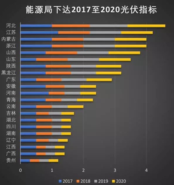 2017-2020年下達普通地面指標54.5GW,每年安排8GW光伏領跑者指標。合計86.5GW。(不含分布式)