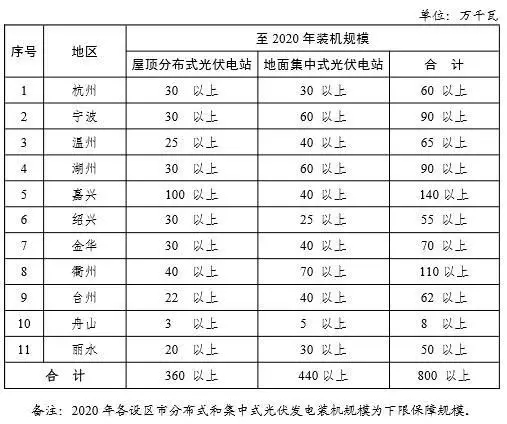浙江省到2020年的規(guī)劃目標(biāo)為800萬kW,2017年1季度底,累計安裝了443萬kW,還剩357萬kW的容量。具體各地級市的規(guī)劃目標(biāo)如下表。