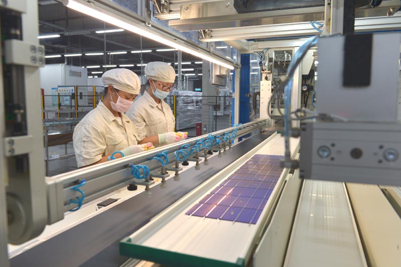 7月24日,江蘇林洋新能源有限公司的員工正在利用自動(dòng)焊接設(shè)備對(duì)光伏組件進(jìn)行焊接。