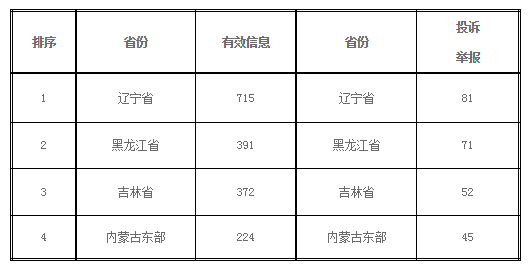 表二:2017年1-6月有效信息與各省投訴舉報(bào)排名情況