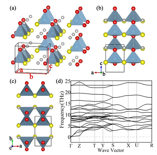 圖1通過計算預(yù)測得到的(a)Pmc21空間群LiAlSO的晶體結(jié)構(gòu),沿(b)b-軸和(c)c-軸的視圖以及(d)計算得到的聲子譜?;疑?、黃色和紅色的圓球分別代表Li,S和O原子。四面體代表AlS2O2單元。