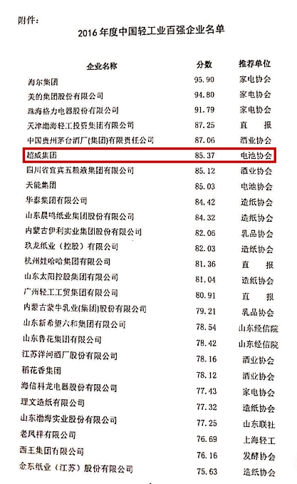 中國儲能網(wǎng)訊:6月20日,“‘智慧輕工’高峰論壇暨中國輕工業(yè)百強(qiáng)企業(yè)頒獎盛典”在北京舉行,大會發(fā)布了“2016年度中國輕工業(yè)百強(qiáng)企業(yè)”榮譽榜單。超威集團(tuán)再度入圍2016年度中國輕工業(yè)百強(qiáng)企業(yè),總排名躍升至第6位,較上一年度大幅提升了7位。至此,超威集團(tuán)已連續(xù)5年蟬聯(lián)電池行業(yè)首位。這是超威集團(tuán)堅持科技和創(chuàng)新,加快轉(zhuǎn)型升級結(jié)出的又一碩果。