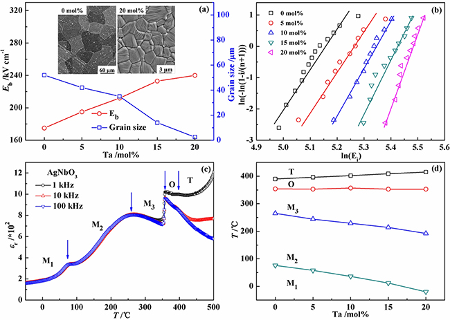 儲(chǔ)能材料與器件是近年來(lái)功能材料領(lǐng)域的研究熱點(diǎn),其中具有高儲(chǔ)能密度和高可靠性電介質(zhì)儲(chǔ)能材料在高能脈沖功率技術(shù)等領(lǐng)域有著不可替代的應(yīng)用。這方面具有雙電滯回線特征的反鐵電儲(chǔ)能材料一直備受關(guān)注,但過(guò)去的研究主要集中在鋯鈦酸鉛(Pb(Zr,Ti)O3)體系。基于在鈮酸鹽基無(wú)鉛壓電陶瓷方面的長(zhǎng)期工作經(jīng)驗(yàn)上,李敬鋒教授課題組對(duì)鈮酸銀(AgNbO3)的反鐵電性及其儲(chǔ)能特性開展研究,發(fā)現(xiàn)鉭(Ta)摻雜可以調(diào)控AgNbO3的相變,顯著提升介電擊穿強(qiáng)度和反鐵電性,其最大可釋放儲(chǔ)能密度達(dá)到4.2 J/cm3,比純AgNbO3提升了260%,且在20-120℃內(nèi)可釋放儲(chǔ)能密度的變化幅度維持在±5%以內(nèi)。