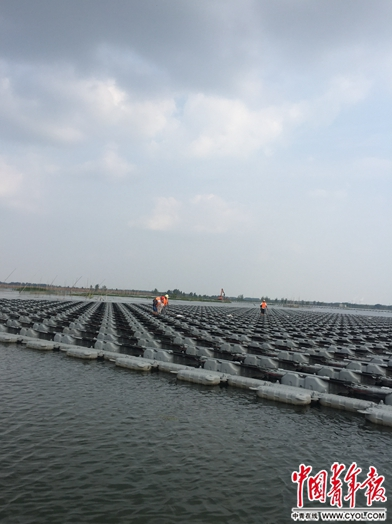 劉龍村邊上的泥河早前只是一條大溝,連著淮河,后來“越陷越深,塌成這么大”。馬趙匡身后的水面有4000畝,波光閃閃,他在岸上搬運(yùn)組件、拼接,然后拖入深達(dá)7米的水中央。