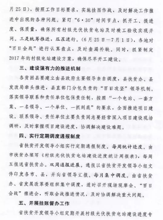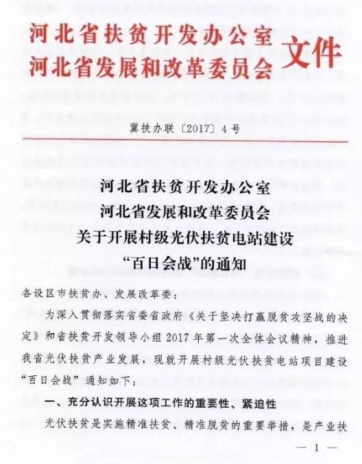 4月6日,河北省扶貧辦、發(fā)改委聯(lián)合印發(fā)了《關(guān)于開展村級(jí)光伏扶貧電站建設(shè)“百日會(huì)戰(zhàn)”的通知》(冀扶辦聯(lián)[2017]4號(hào)),通知指出: