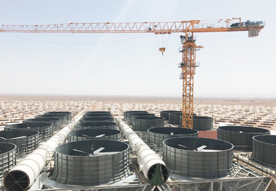 施工現(xiàn)場是1430公頃的荒漠地帶,65萬塊光伏鏡面裝置整齊鋪設(shè),巨大的熔鹽罐和集熱塔分布其間。