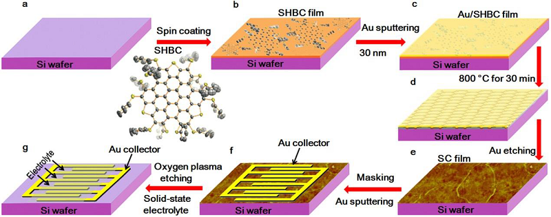 該研究團隊利用納米金薄層的二維納米限域效應和金催化作用,采用自下而上逐步熱解法成功制備出連續(xù)、均勻的硫摻雜石墨烯薄膜;以該薄膜為電極,采用微納加工技術構建微型超級電容器。該電容器具有體積比容量高(582F/cm3)、循環(huán)穩(wěn)定性好和功率密度高(1191W/cm3)等優(yōu)點。機理研究表明,納米金薄層的存在有利于形成穩(wěn)定的S-Au鍵、C-S鍵,從而實現(xiàn)了納米石墨烯主體結構完整、硫元素均勻摻雜和薄膜厚度均一。該工作為自下而上法可控制備大面積、連續(xù)石墨烯薄膜提供了新思路;也為硫摻雜石墨烯提供了新方法,并證實了硫摻雜能顯著提高石墨烯薄膜的電化學性能。
