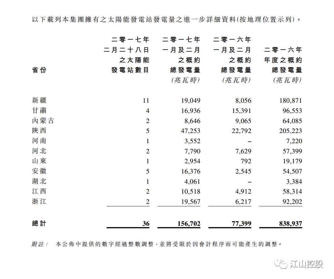 中國儲能網(wǎng)訊:3月13日,從事投資及營運太陽能光伏發(fā)電項目的江山控股有限公司(“江山控股”或“公司”,連同其附屬公司統(tǒng)稱“集團”,港交所股份代碼:295)欣然宣布,根據(jù)集團現(xiàn)有之初步營運統(tǒng)計數(shù)據(jù),集團擁有之太陽能發(fā)電站于2017年1月及2月之總發(fā)電量約為156,702兆瓦時,較去年同期的約77,399兆瓦時大幅上升約102%。而本集團于2017年2月28日的總裝機量達1,150.3兆瓦。