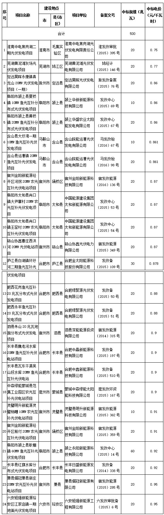 根據(jù)《國家能源局關于調(diào)整2016年光伏發(fā)電建設規(guī)模有關問題的通知》(國能新能〔2016〕383號)精神,我省提前使用2017年度建設規(guī)模50萬千瓦,追加2016年度普通光伏電站建設規(guī)模。2016年12月31日,我們通過公開競爭性比選方式,確定了淮南中電焦崗湖二期光伏發(fā)電項目等24個項目,并報請國家能源局審核同意。