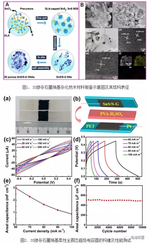 針對上述問題,王奇和韓敏課題組開展了合作研究,利用可控熱轉換油胺包裹的SnS2-SnS混相納米盤前驅物的策略,巧妙地將有機分子的碳化、摻雜、相轉換和自組裝等重要的物理化學過程集成于一體,首次成功實現(xiàn)了硫摻雜石墨烯(S-G)和SnS雜化納米片的原位合成與組裝,得到了新穎的3D多孔SnS/S-G 雜化納米建筑(HNAs,如圖1所示)。相比傳統(tǒng)合成策略,該方法具有簡單高效、重現(xiàn)性好、可規(guī)模化制備等優(yōu)點,為延伸和拓展摻雜石墨烯材料在清潔能源、光電和傳感等重要技術領域的應用奠定了基礎。在三電極體系中以KOH溶液作為電解液,所得3D石墨烯復合材料質量比電容高達642 F g-1 (電流密度為1 A g-1),遠高于近來報道的石墨烯復合物和其他電活性材料(如體相和納米級的SnS及其復合物、G-Mn3O4納米棒、G-CoS2、2D CoS1.07/N- C納米雜化體等)。