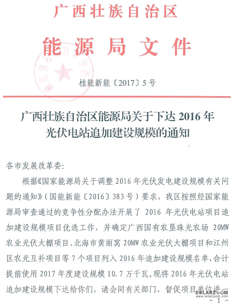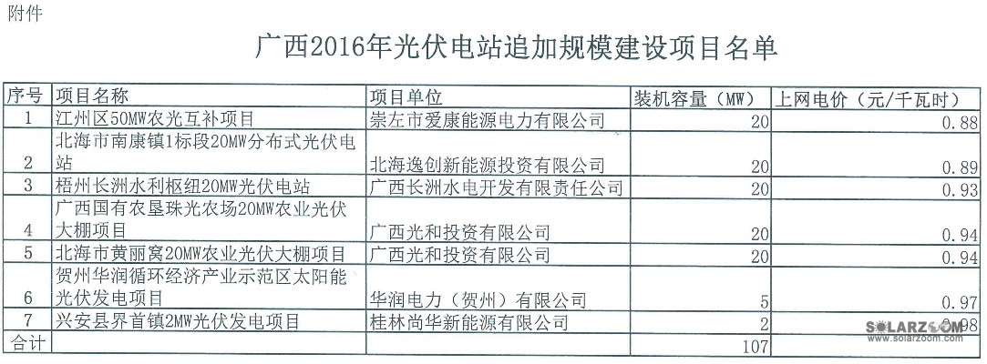 中國儲能網(wǎng)訊:近日,廣西能源局下達(dá)《2016年光伏電站追加規(guī)模的通知》。《通知》指出此次廣西共有7個項目列入2016年 追加建設(shè)規(guī)模名單,合計提前使用2017年度建設(shè)規(guī)模107MW。項目不能在2017年6月30日前并網(wǎng)發(fā)電的,追加的建設(shè)規(guī)模作廢。
