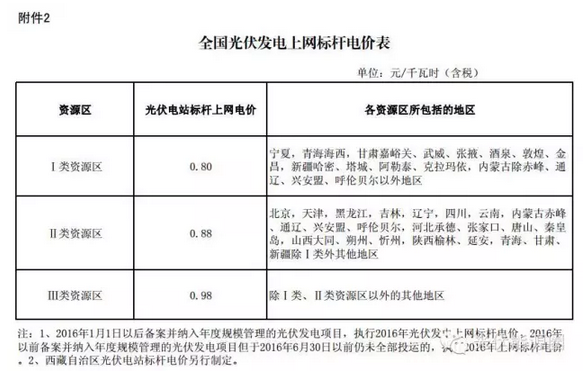 2016年標(biāo)桿電價如下圖: