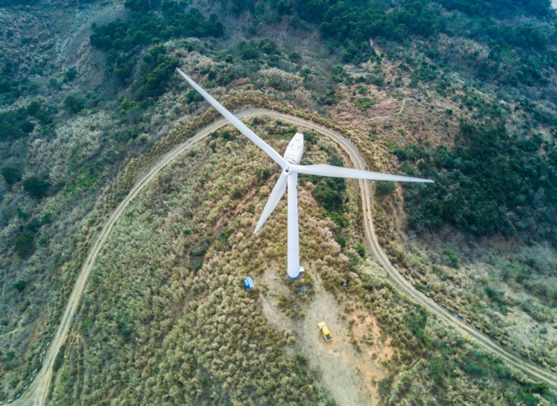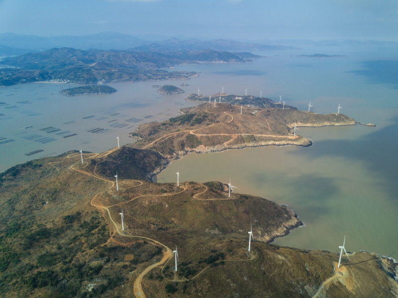 空中俯瞰北關(guān)島上的霞關(guān)風(fēng)電場(2月15日攝)。