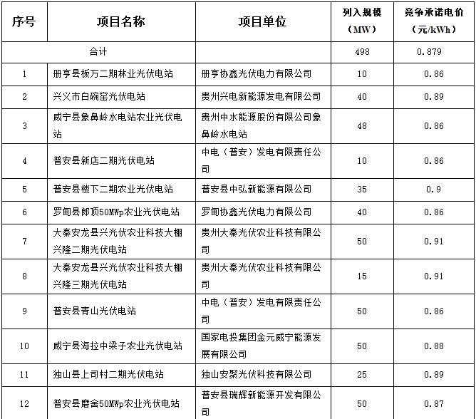 中國(guó)儲(chǔ)能網(wǎng)訊:根據(jù)《國(guó)家能源局關(guān)于調(diào)整2016年光伏發(fā)電建設(shè)規(guī)模有關(guān)問(wèn)題的通知》(國(guó)能新能〔2016〕383號(hào))文件精神和《貴州省普通光伏電站項(xiàng)目競(jìng)爭(zhēng)性配置實(shí)施辦法(試行)》的要求,2016年貴州省普通光伏發(fā)電項(xiàng)目追加建設(shè)規(guī)模競(jìng)爭(zhēng)性配置工作,采取企業(yè)自主競(jìng)價(jià)等相關(guān)競(jìng)爭(zhēng)性要求申報(bào)項(xiàng)目、第三方機(jī)構(gòu)評(píng)選的方式進(jìn)行優(yōu)選,共有23個(gè)項(xiàng)目申報(bào)參與競(jìng)爭(zhēng)性評(píng)選,總裝機(jī)規(guī)模98萬(wàn)千瓦。經(jīng)過(guò)第三方機(jī)構(gòu)評(píng)選,共有15個(gè)項(xiàng)目獲得優(yōu)選配置規(guī)模,追加總規(guī)模為49.8萬(wàn)千瓦,經(jīng)國(guó)家能源局同意,現(xiàn)予公布。