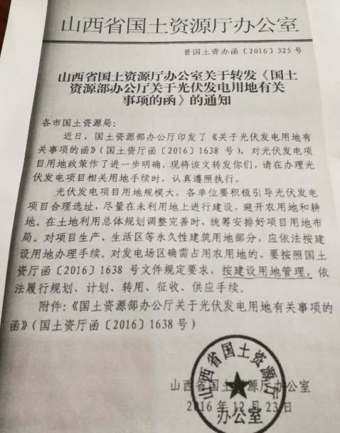 2016年底,山西省國土資源廳發(fā)文要求“各單位要積極引導光伏發(fā)電項目合理選址,盡量在未利用地上進行建設、避開農(nóng)用地和耕地。對發(fā)電場區(qū)確需占用農(nóng)用地的,要按照國土資廳函【2016】1638號文件規(guī)定要求,按建設用地管理,依法履行規(guī)劃、計劃、轉用、征收、供應手續(xù)”。
