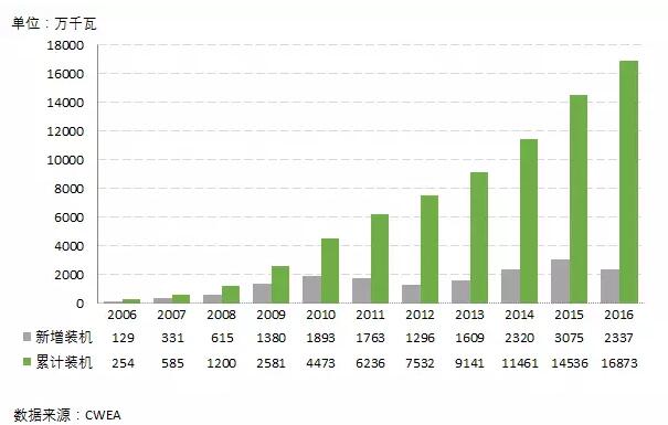 圖1 2006年至2016年中國新增和累計風(fēng)電裝機(jī)容量